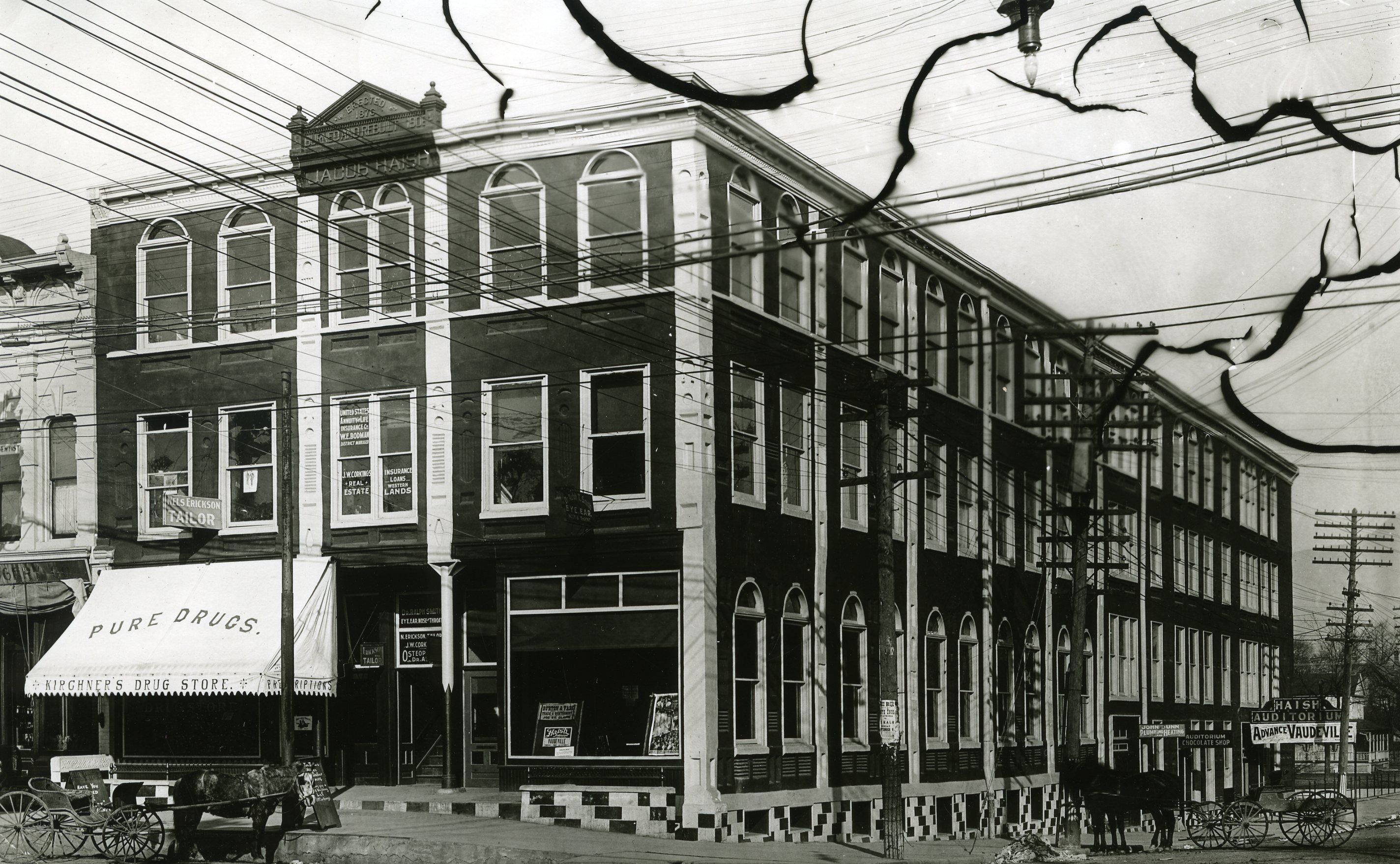 The Haish Auditorium (an opera house he had built, there is an incredible photo here) is referenced throughout the float: on the pennants on the wagon, "the house of feature shows," a projector on the back of the wagon, and the advertisement draped on the horse: "Compliments of Haish Auditorium. Free show this afternoon."